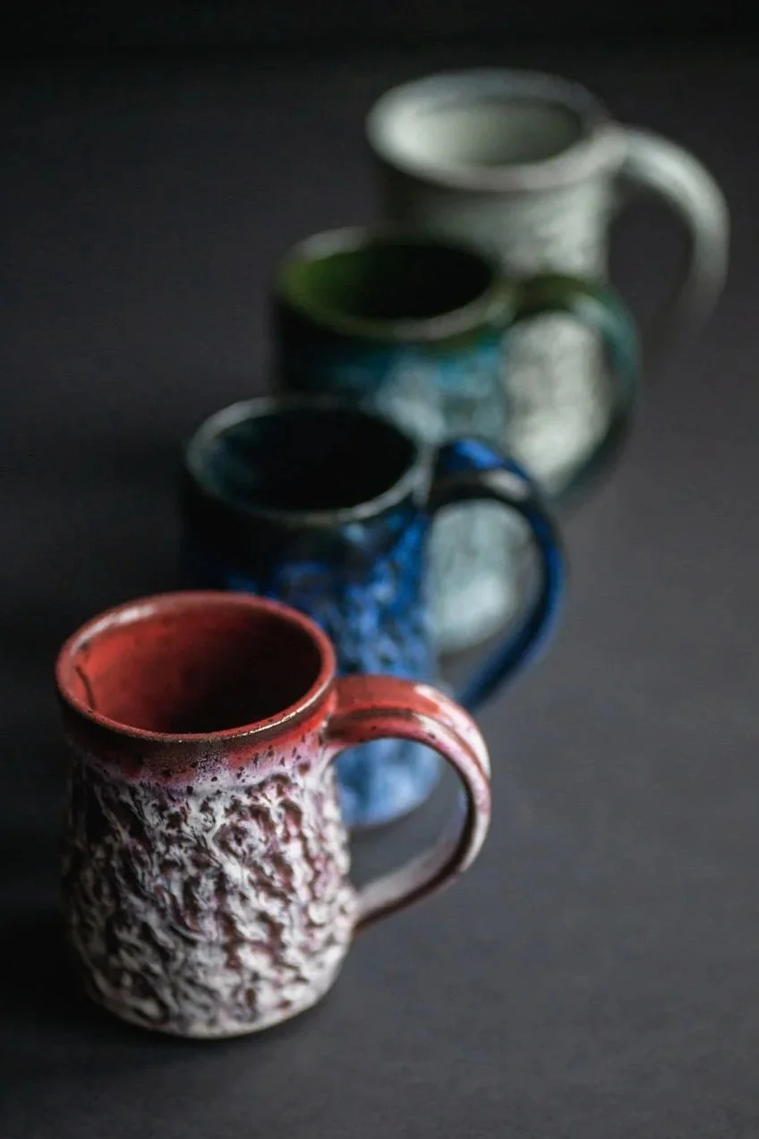 Igneous was created due to Pilar’s obsessive need to texture every tall cylinder. Inside each Igneous vessel, the viewer is greeted with a rich jewel tone with a contrasting white speckling on the outside of the vessel walls.