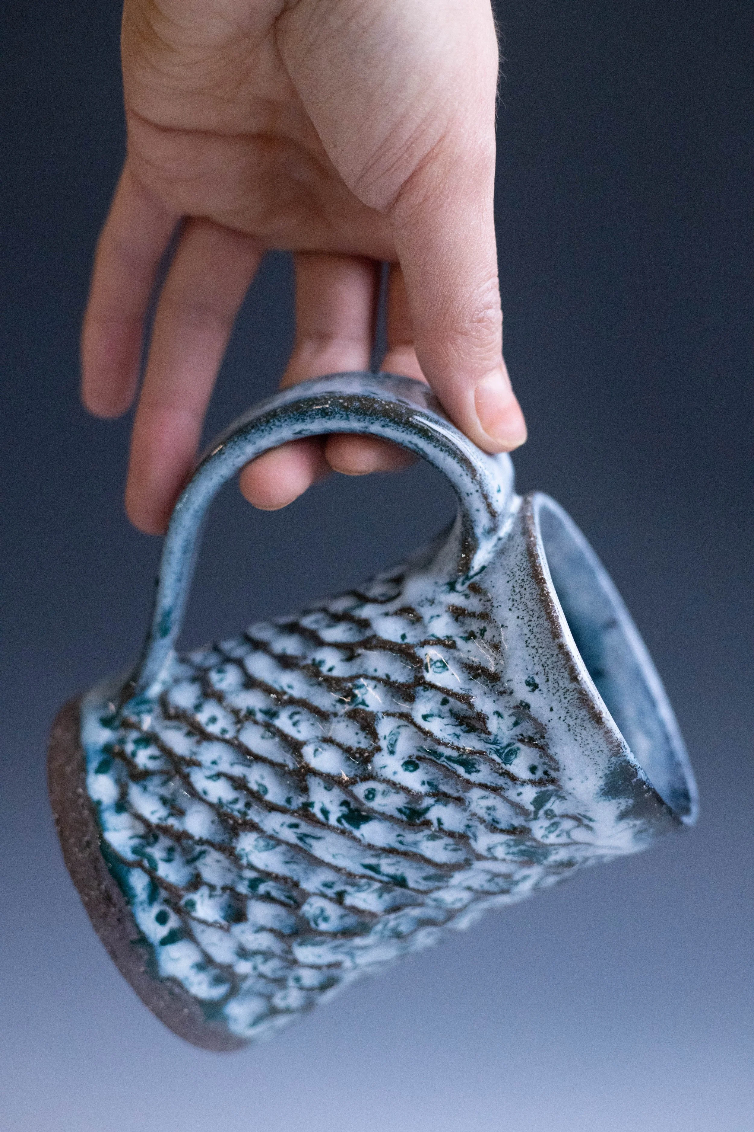 Igneous was created due to Pilar’s obsessive need to texture every tall cylinder. Inside each Igneous vessel, the viewer is greeted with a rich jewel tone with a contrasting white speckling on the outside of the vessel walls.